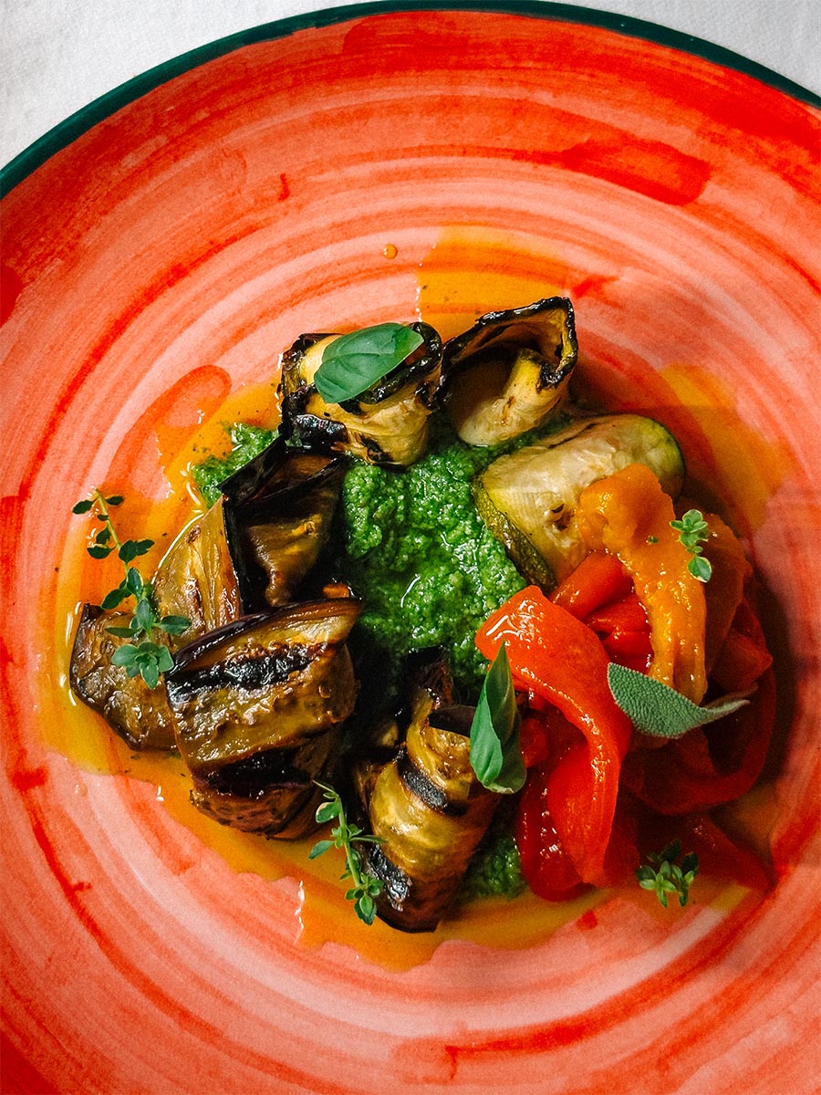 Con pinzimonio di erbe del Mediterraneo e pesto di rucola leggermente piccante